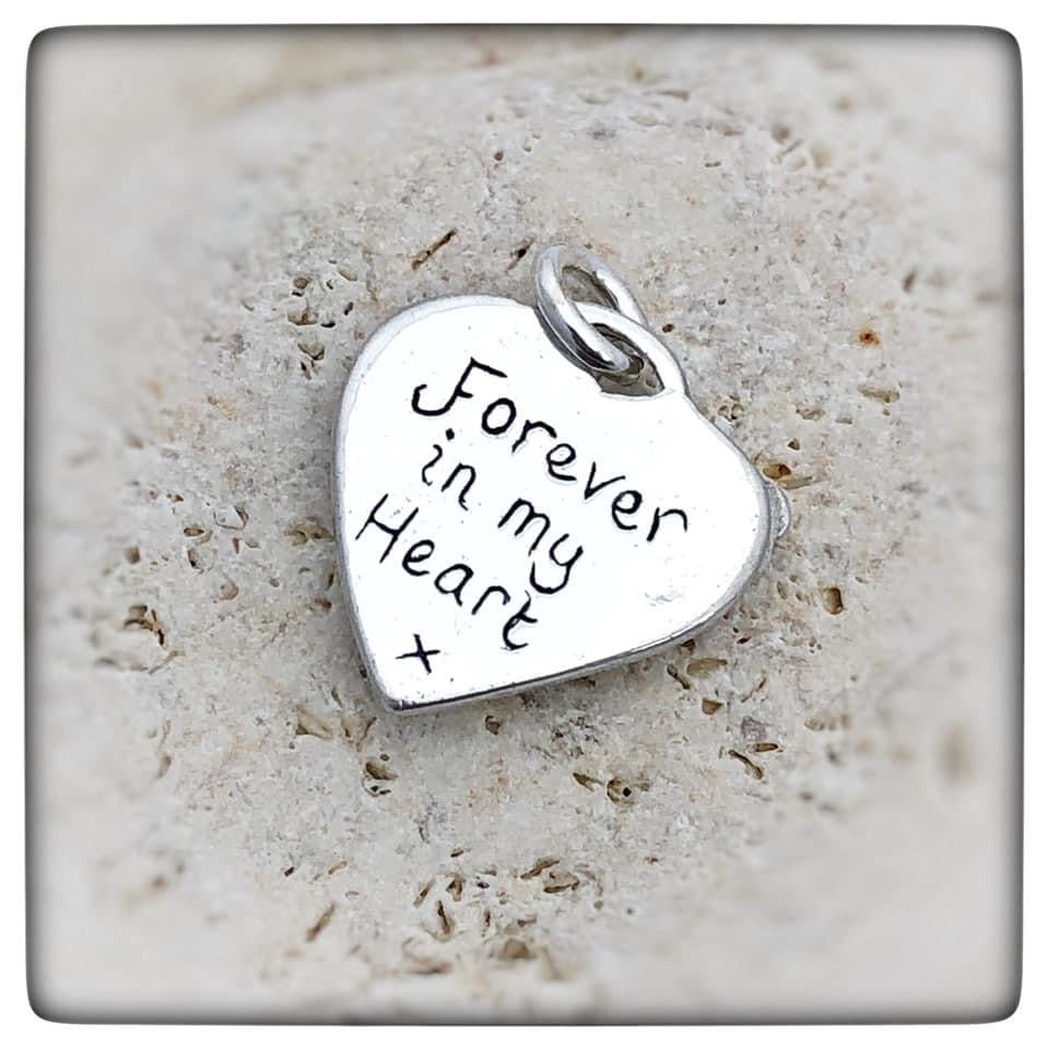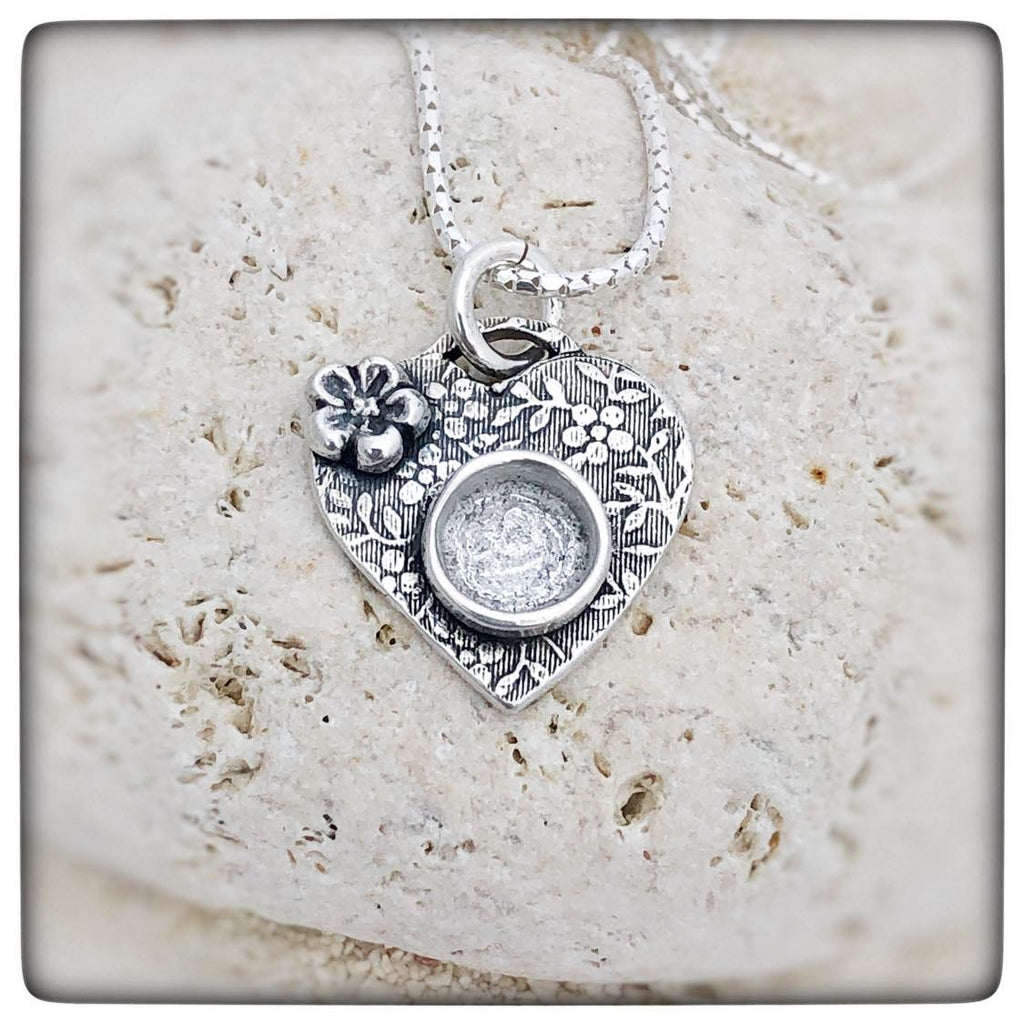 The “Bella” Forget Me Not Heart Necklace is a one-of-a-kind, handcrafted memorial piece. Its delicate forget me not texture and circular bezel can hold your loved one’s ashes, hair, or fur. With a choice of 16” or 18” sterling silver chain included in the price, this necklace is a beautiful and meaningful way to keep your loved one close to your heart.